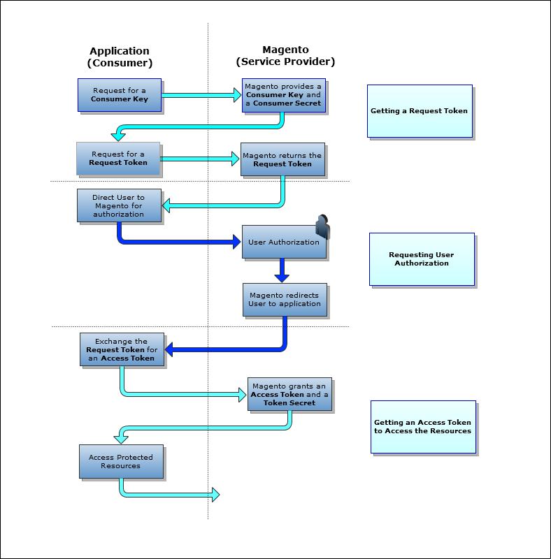 - Consumer - A third-party application that uses OAuth to access the Magento API. This application must be registered in the Magento system to receive the Consumer Key and Consumer Secret.