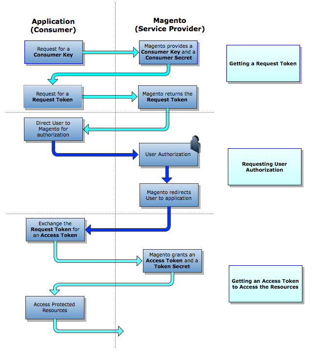 - The third-party application will utilize the provided consumer credentials to call Magento store for getting the access token to access the data.