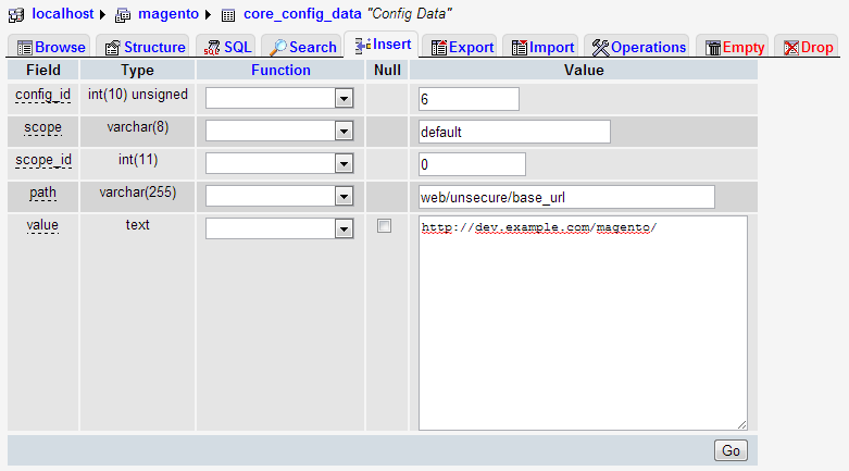 UPDATE core_config_data SET value='http://dev.example.com/' WHERE config_id=354 or config_id=355;Example 2—