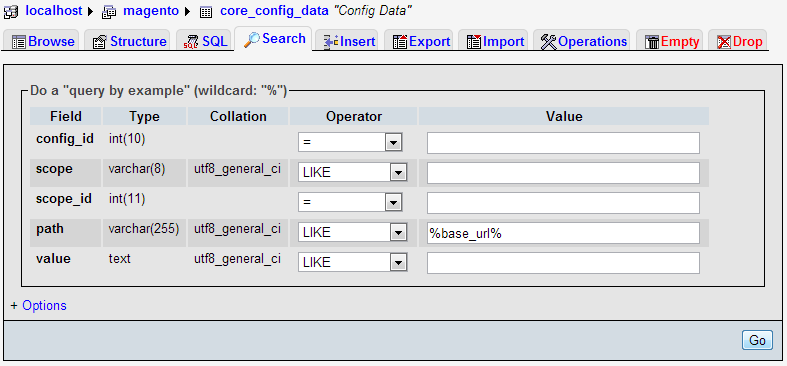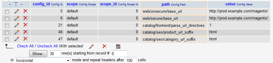The following sections discuss how to change the base URL paths from http://prod.example.com to http://dev.example.com using SQL commands and phpmyadmin:
