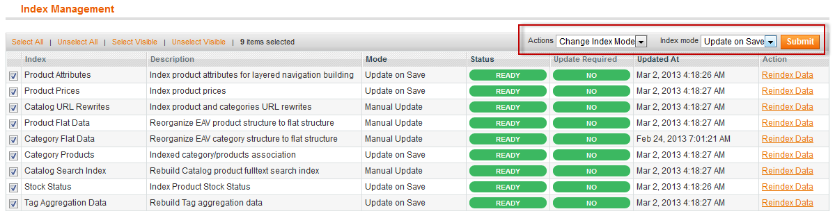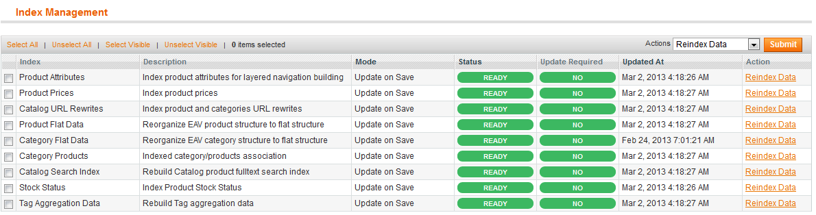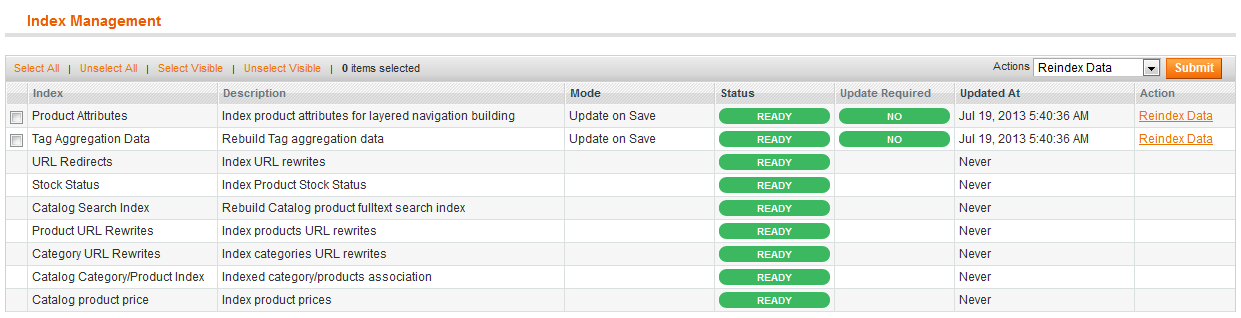 | Processing | Wait for cron to finish or run If indexers are Processing for an extended period of time, run the command discussed in Clearing Magento var/ Subdirectories and refresh the Index Management page. |